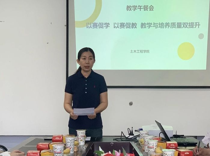 6月12日,土木工程学院举办题为“以赛促学,以赛促教,教学与培养质量双提升”的教学午餐会。活动由土木工程学院副院长陈岩主持,学院教师张馨月、路立娜作主题分享,学院全体教师参加。