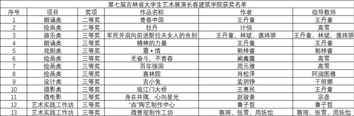 近日,吉林省教育厅公布吉林省第七届大学生艺术展演获奖名单。学校团委经评选后推报77件作品参加展演,其中获评二等奖2项、三等奖11项,学校荣获优秀组织单位奖。