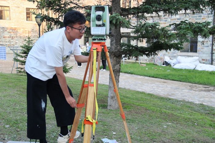 实训的步骤很复杂,需要设立仪器前应将点位绘制于地面,将全站仪的红外线垂直对上点位交叉线,再调整仪器脚架将水平气泡居中,再扭动中心螺丝将仪器红外线重新对中,完成粗调平,再进一步调整角螺旋,使仪器完成精准调平后再进行与把杆员的交流测量。这次经历,是我大学生涯中首次与同窗们如此紧密无间地并肩作战。这段宝贵的时光,不仅让我掌握了专业知识与技能,更让我学会了如何在团队中发光发热,为实现共同目标不懈努力。