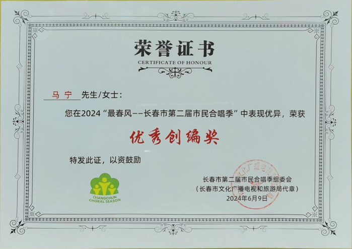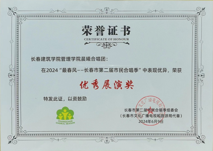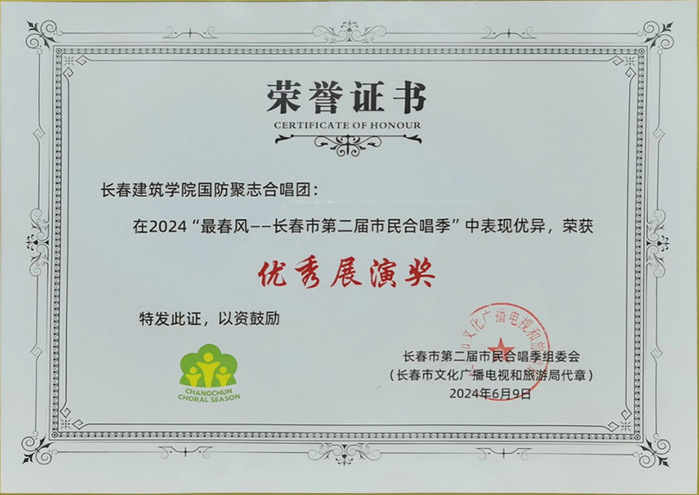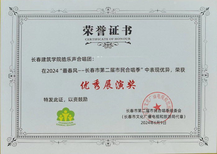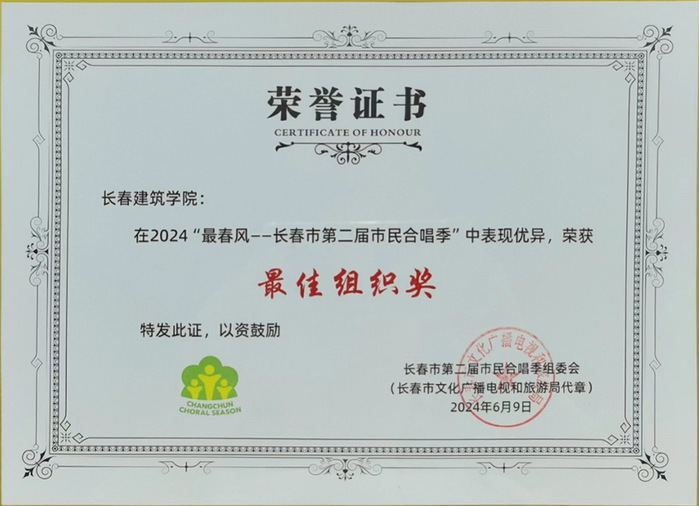近日,2024“最春风——长春市第二届市民合唱季”圆满落幕。经学校团委选送,相关学院全力配合,指导老师悉心指导,参演同学刻苦排练,学校三个合唱团参演的歌曲分别荣获优秀展演奖;学校团委马宁老师荣获优秀创编奖;学校荣获最佳组织奖。
