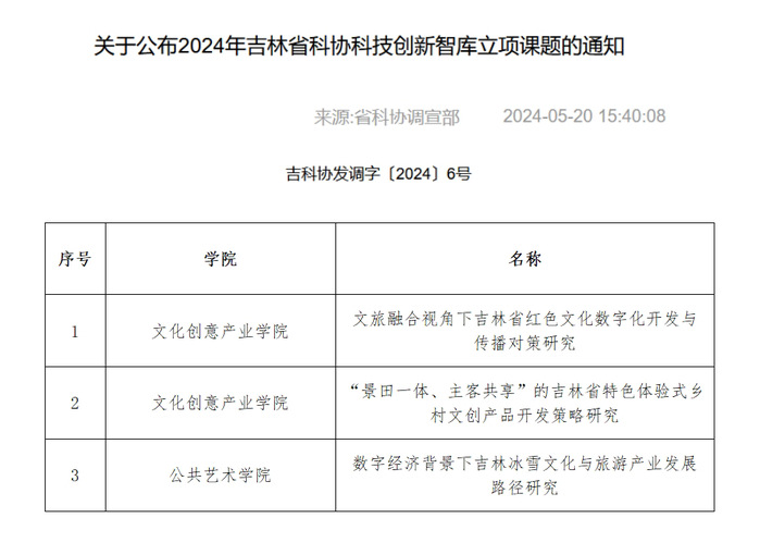 日前,吉林省科学技术协会、吉林省社会科学院等部门先后公布了2024年度吉林省智库基金项目,学校突破获批吉林省科协科技创新智库项目3项、吉林省社科院智库基金招标项目2项,共计到账经费7万元。吉林省科协科技创新智库项目全省立项58项,学校位列民办高校首位;吉林省社科院智库基金招标项目全省立项103项,学校并列民办高校第一。
