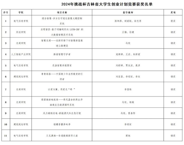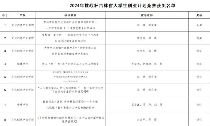 近日,共青团吉林省委员会、吉林省社会科学院、吉林省科学技术协会、吉林省教育厅、吉林省人力资源和社会保障厅、吉林省学生联合会下发《关于开展2024 年“挑战杯”吉林省大学生创业计划竞赛通报表扬工作的通知》,学校21项作品获奖。其中,在2024年吉林省“挑战杯”大学生创业计划竞赛(主赛道)中荣获银奖1项、铜奖10项;在2024年吉林省“挑战杯”大学生创业计划竞赛(社会调研专项赛)中文化创意产业学院项目《吉林省冰雪文化旅游产业发展与创新研究——针对吉林省7个滑雪度假景区的调研》获金奖,另获银奖2项、铜奖7项;电气信息学院徐忠原老师荣获“优秀指导教师”荣誉称号。