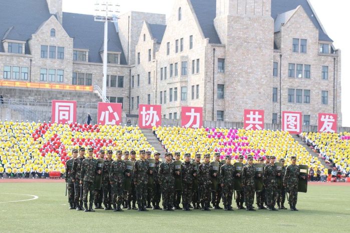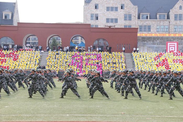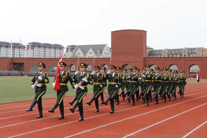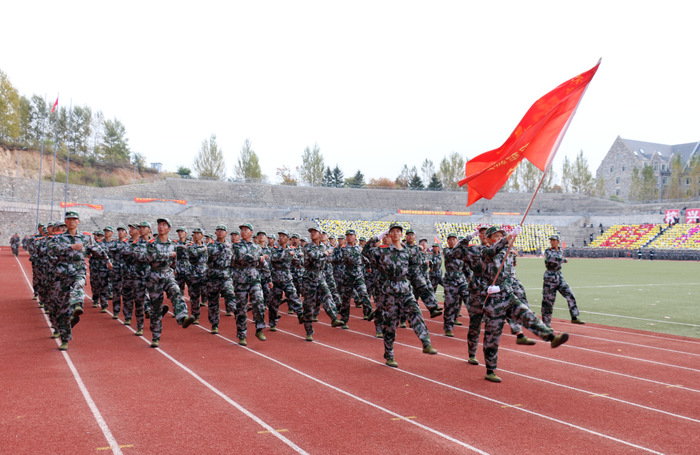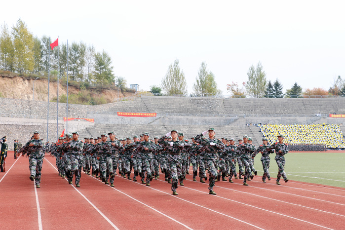 在雄壮的阅兵进行曲中,30支受阅方队,身着迷彩戎装,踏着稳健的步伐,昂首挺胸、意气风发地依次走过主席台接受检阅。整齐划一的动作、坚定自信的眼神、铿锵有力的口号展现了新时代大学生的良好精神风貌。