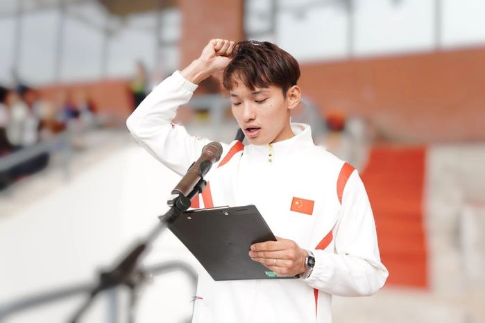 单金成老师和张鸿阳同学分别代表裁判员和运动员宣誓,承诺将秉持公平、公正、公开的原则,遵守比赛规则,尊重对手、尊重裁判、尊重观众,赛出风格,赛出水平,用实际行动践行体育精神。
