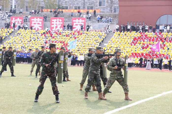 军训汇报表演中的长建学子,英姿飒爽,朝气蓬勃。新生们的匕首操、刺杀操、拳术表演、花枪表演轮番上阵,军训教官们的警卫盾牌术、防暴处突表演精彩纷呈,赢得了在场领导和师生的阵阵掌声。