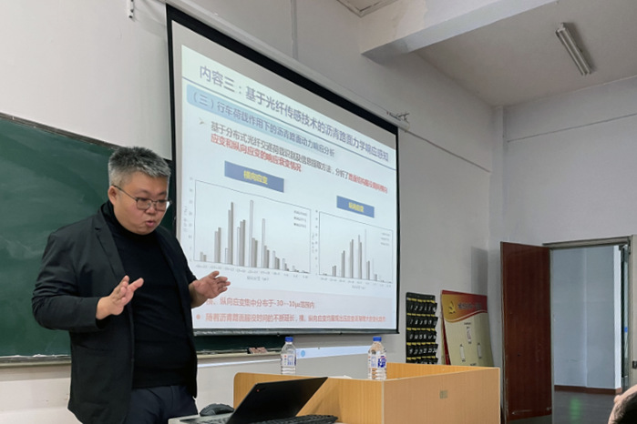 赵含长期致力于路基路面安全运维保障相关技术的研究工作,已完成省内勘察设计项目百余项,主持并完成了相关科研项目十余项,获得了1100余万元的研究经费资助,其研究成果均达到了国际先进水平或国内领先水平。他发表了学术论文12篇,其中SCI文章1篇;编制了4部标准、撰写了1部著作,并获得了7项专利授权和9项软件著作权。此外,他还荣获了中国公路学会科学技术奖两项以及吉林省科学技术进步奖一项。在讲座中,赵含结合自己丰富的科研实践经验,以深入浅出的方式为师生们阐释了分布式光纤监测技术的原理,并生动形象地展示了该技术在保障道路安全、延长路面使用寿命等方面的显著成效。