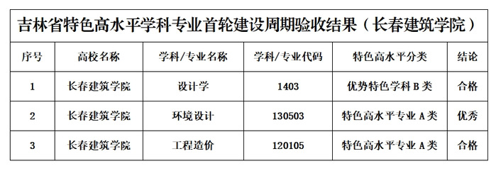 近日,吉林省教育厅公布吉林省特色高水平学科专业首轮建设周期验收结果,学校设计学(优势特色学科B类)、环境设计(特色高水平专业A类)和工程造价(特色高水平专业A类)顺利通过验收,这是学校学科专业建设取得的又一重要成果。