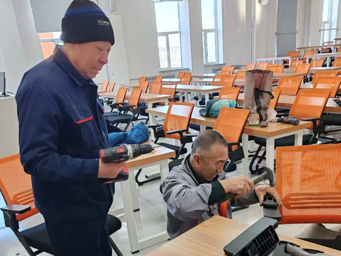 在教学楼内,桌椅板凳的维修工作同步进行。这些陪伴学生度过无数学习时光的“老朋友”,因长期使用难免有所损坏。后勤处木工维修班组的师傅们对各学院教学楼内教室的桌椅板凳及卫生间吊棚进行了细致排查。对松动的桌椅进行加固;对损坏的部件予以更换;对卫生间洗漱间脱落的吊棚石膏板进行维修。他们认真细致的工作态度,让每一张桌椅重焕生机,静待新学期同学们的归来。