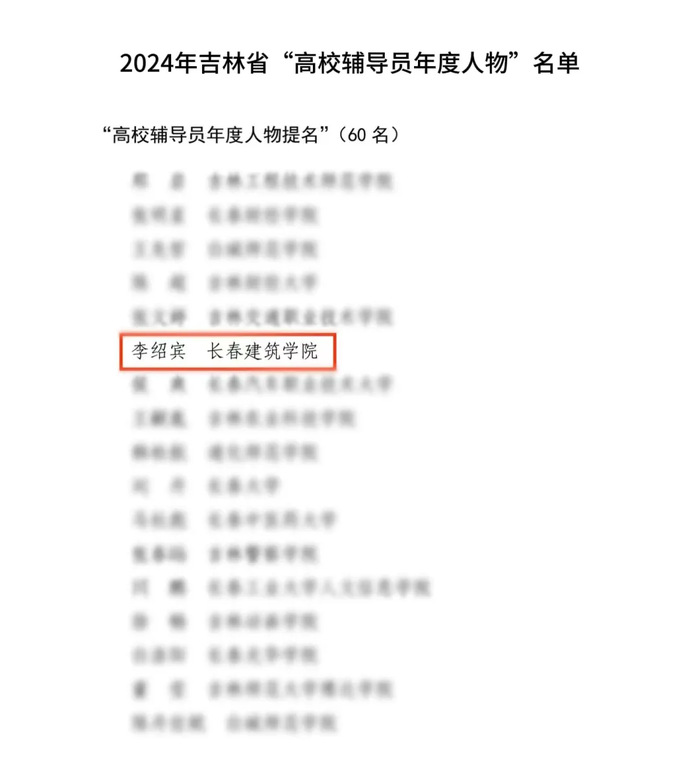 近日,吉林省教育厅公布了2024年吉林省“高校辅导员年度人物”推选展示活动评选结果。经学校推荐、专家评审,评选出吉林省“高校辅导员年度人物”10人、“高校辅导员年度人物提名”60人。学校建筑与规划学院分团委书记兼2023级辅导员李绍宾荣获2024年吉林省“高校辅导员年度人物”提名奖。