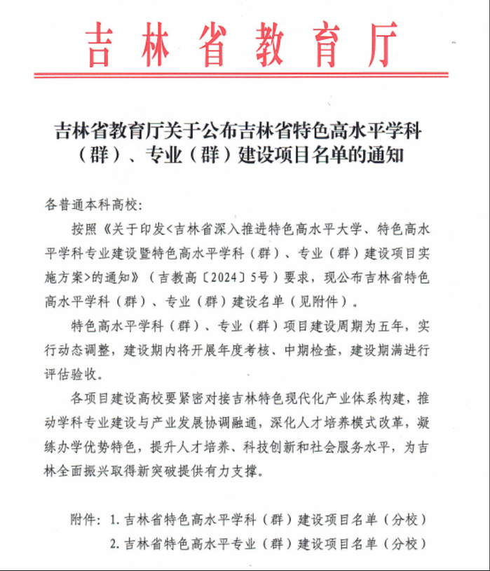 学校入选吉林省特色高水平学科(群)、专业(群)建设项目,为学校的学科、专业建设特色发展带来了重大机遇,也提出了更高的要求。下一步,学校将严格按照建设要求,紧密对接吉林特色现代化产业体系,进一步优化资源配置,强化特色发展路径,推动学科专业建设与产业发展协调融通,深化人才培养模式改革,凝练办学优势特色,提升人才培养、科技创新和社会服务水平,为吉林全面振兴取得新突破贡献力量。