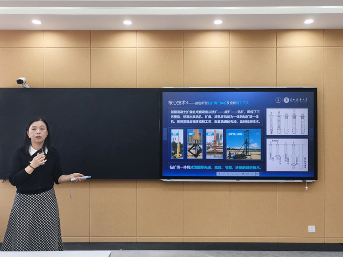 钱永梅教授以科研育人新范式开篇,着重强调科研能力培养前移的重要性,指出本科生群体正在成为科研创新的新兴力量。她结合自身团队的创新实践,系统阐释了新型混凝土扩盘桩技术的研发脉络:从桩型演变史切入,详细解析该技术在施工工艺革新、力学性能优化等方面的突破;通过图文并茂的演示和详实的数据对比,系统阐释了该技术从理论研究到工程应用的完整创新链条。特别针对两项核心技术——“新型半面桩多工况全程可视化试验方法”与“创新滑移线理论智能化成套设计计算平台”,钱教授通过实验室模拟视频与工程实例分析,生动展现了科研成果转化生产力的具体路径。钱教授结合工程案例,对复杂地质条件下的桩基设计优化、施工参数控制等难点问题进行了深入剖析,为现场师生提供了极具参考价值的技术解决方案。报告会结束后,钱教授和与会师生进行了学术交流,耐心细致的回答了师生提出的问题,并在科研项目申报的选题、工程实践中出现的问题等方面给予了指导和帮助,师生们纷纷表示受益匪浅。