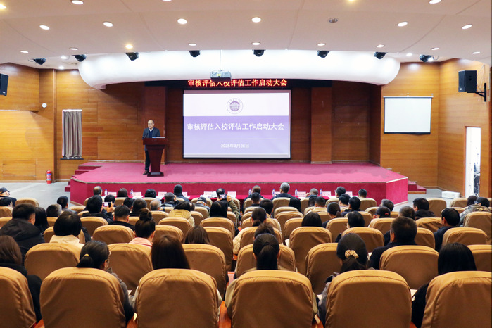 为扎实推进学校审核评估工作,3月28日上午,学校召开审核评估入校评估工作启动大会,学校领导班子成员、入校评估工作12个专项工作组全体成员、各教学单位科级以上人员、教学秘书、资产管理员、辅导员等300余人参加会议。会议由张东鸣副校长主持,评建工作办公室解读《bw必威西汉姆联官网本科教育教学审核评估入校评估工作方案》,并对迎评工作任务进行了说明,任玉珊校长作总结性发言。