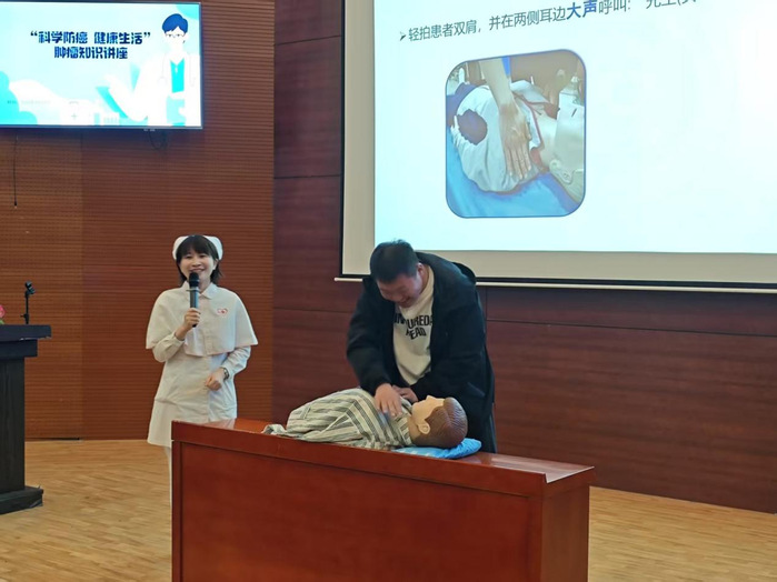讲座中,专家团耐心地为同学们答疑解惑,现场气氛热烈。医护人员还为大家演示心肺复苏,讲授健康知识。