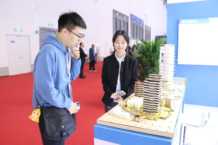 与体验展区同样备受瞩目的就是实物展区。学校建筑与规划学院师生带来了两个实体模型——“舞若蒲帆.掠影如梦—基于适老化理念的社区活动空间设计”及“城市磁悬浮—基于高密度城市的韧性高层设计探索”。这是来自学校两个学生团队的获奖作品,学生代表在展区现场以饱满的热情和专业的态度,向每一个关注作品的参展人详细介绍着他们的创作过程和理念,展示了前瞻性的创新思维、跨学科的协作水平及扎根实际的调研能力,彰显了学校建筑学子在创新意识、技术应用、社会洞察等多维度的综合素养,体现了高等教育“服务社会需求、引领行业发展”的核心使命。