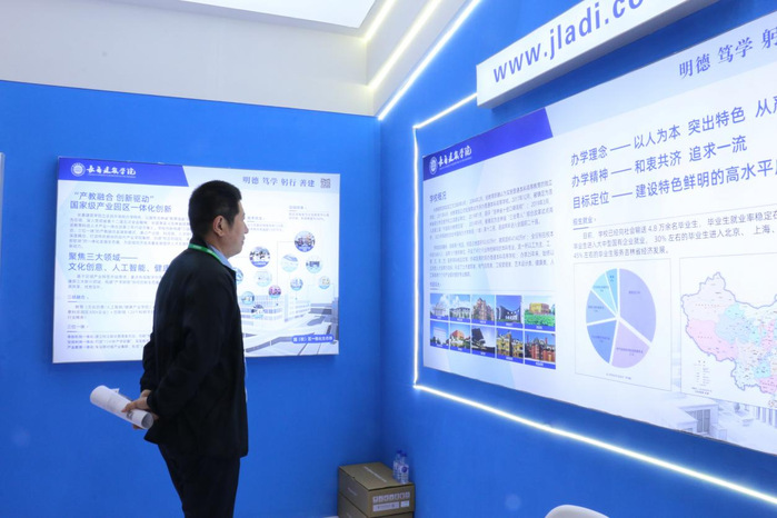 展会现场,学校展区整体以蓝色为基调,以“明德 笃学 躬行 善建”的校训为引领,采用图文展示为主、学校宣传视频播放为辅等多种形式相结合,充分展现学校在教学科研、产教融合、人才培养、创新实践等多方面的主要建设成果,全面呈现了学校在推进特色高水平应用型大学建设,及为区域经济发展提供的强有力人才支撑和创新动力。