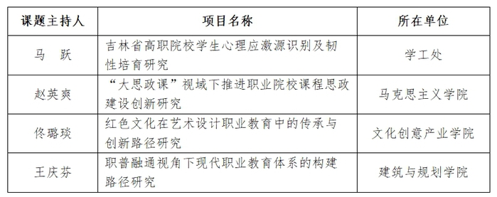 根据吉林省教育厅相关通知,我校首次被允许申报职业教育与成人教育教学改革研究课题。经省教育厅评议,我校4项课题遴选为职业教育与成人教育教学改革研究课题。