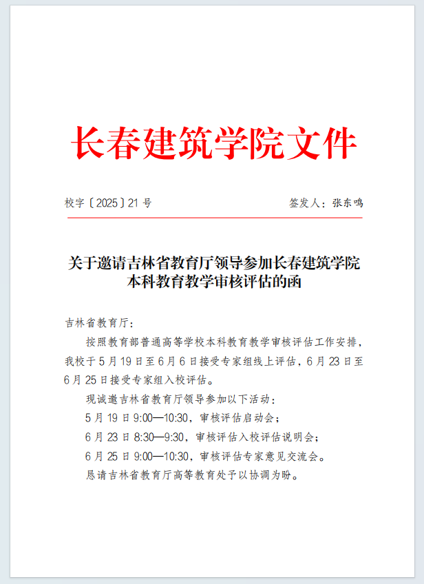 5月6日,向吉林省教育厅高等教育处报送《关于邀请吉林省教育厅领导参加bw必威西汉姆联官网本科教育教学审核评估的函》,诚邀吉林省教育厅领导参加“审核评估启动会”“审核评估入校评估说明会”和“审核评估专家意见交流会”。