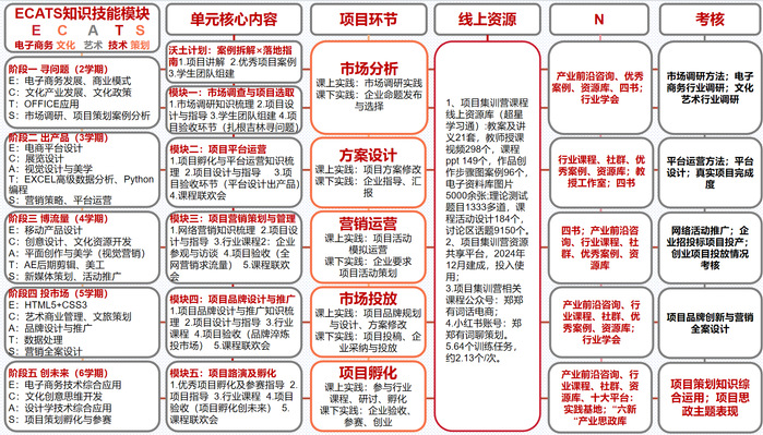 1.以学生能力发展路径为主线,重构教学内容体系。课程紧扣营销策划人才能力模型,系统梳理项目运营各环节所需知识技能,构建“ECATS+N”跨学科知识图谱,将电商运营、文化传播、艺术设计、技术工具和营销策略等模块有机整合,并持续融入产业前沿案例与思政资源,实现教学内容与职业需求无缝衔接,层层递进支撑学生全周期成长。
