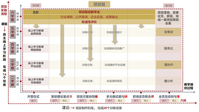 2.以项目实战驱动为核心,创新教学模式与方法。课程首创“五阶六环”项目化教学模式,依托真实企业项目与竞赛课题,融合案例教学、启发引导、团队研讨、角色模拟等多种方法,实施分阶分层培养。基础阶段夯实策划理论,进阶阶段强化实战运营与创新思维,高水平学生则通过孵化创业项目、参与“互联网+”“挑战杯”等竞赛,全面提升策划执行力和创新创业能力。